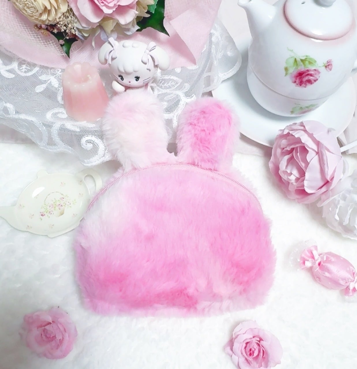 レトロな女の子 うさぎのふわふわファーポーチ レインボー ピンク ウサギ リボン バラ 薔薇 rose ハート クリスマスプレゼント キャンディ いちご イチゴ ロマンズアイ ゆめかわいい もこもこ