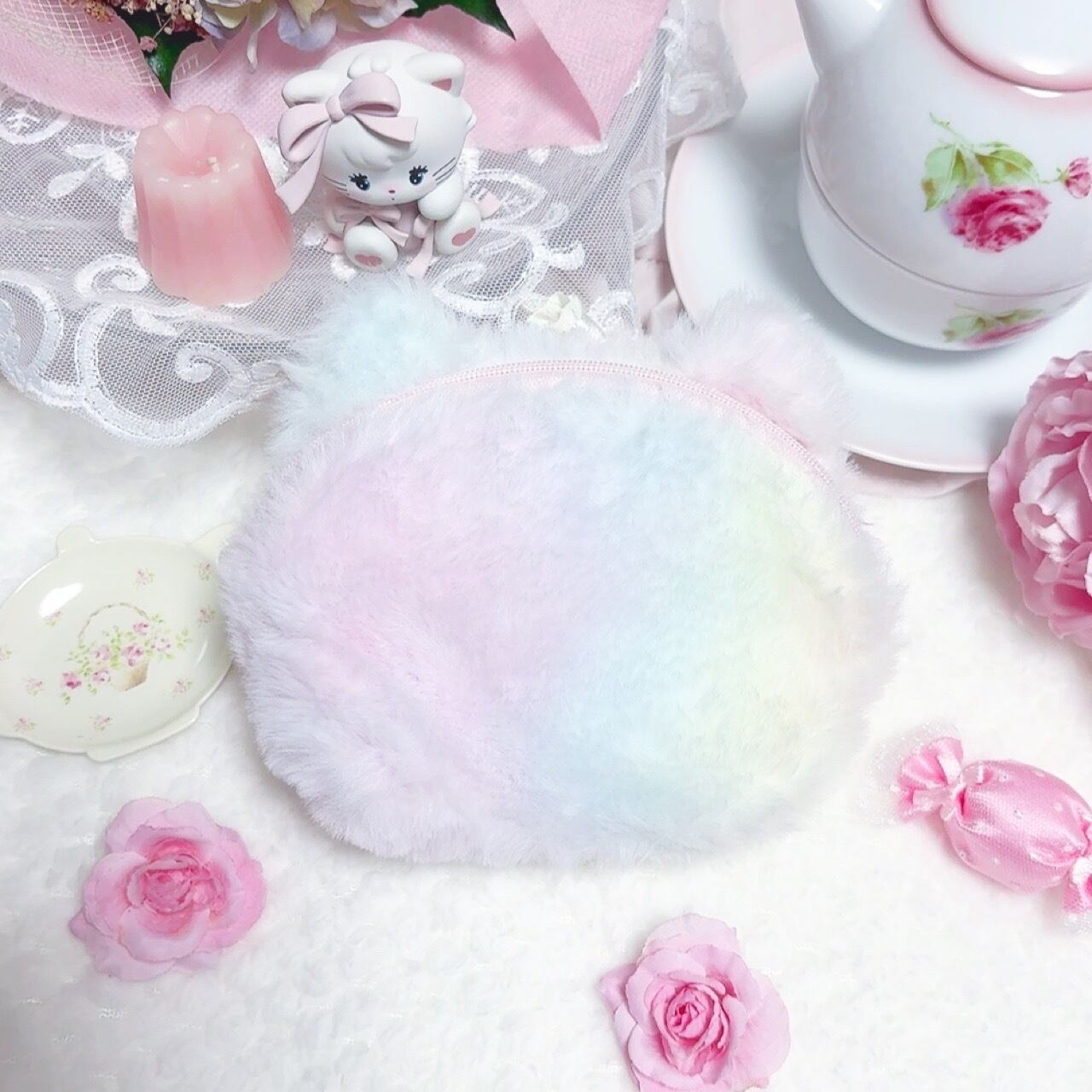 可愛い女の子 ねこのふわふわファーポーチ レインボー ピンク ネコ 猫 リボン バラ 薔薇 rose ハート クリスマスプレゼント キャンディ エコファー ロマンズアイ ゆめかわいい レトロ もこもこ エコファー