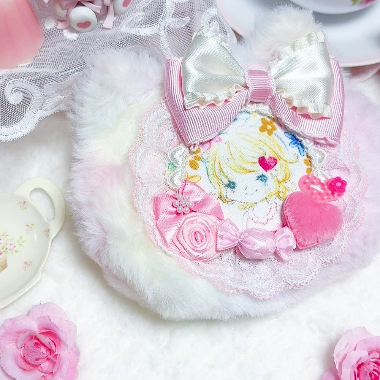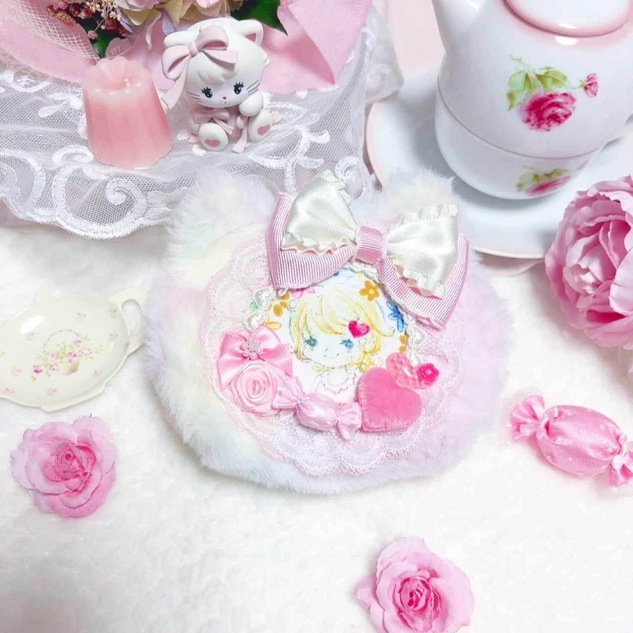 可愛い女の子柄の生地を独自の手法でアップリケに加工して、周りにレースをたっぷりとデコレーションしているオリジナルの作品です。