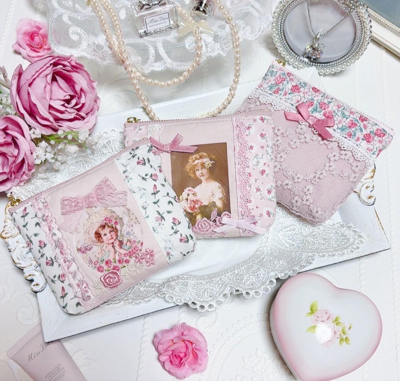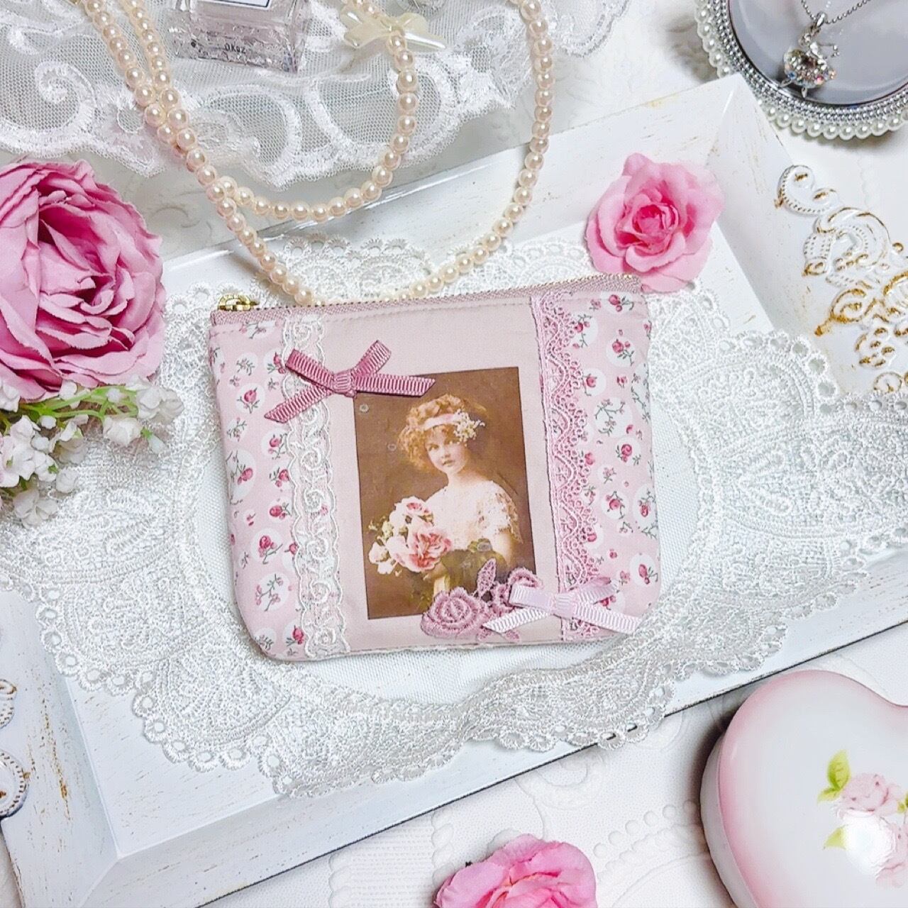 ヴィクトリアンな可愛い女の子のプリントを転写した生地と、リバティを合わせてミニサイズのポーチに仕立てました。