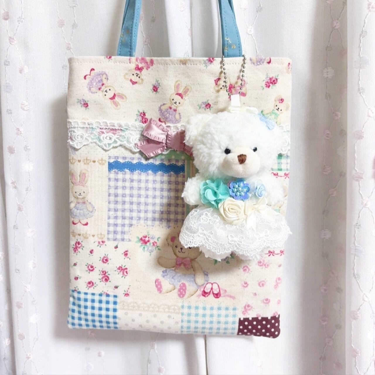アニマルバレリーナのトートバッグ ブルー系 クマのバッグチャーム付き くま うさぎ バレエ バレエコア 薔薇 バラ